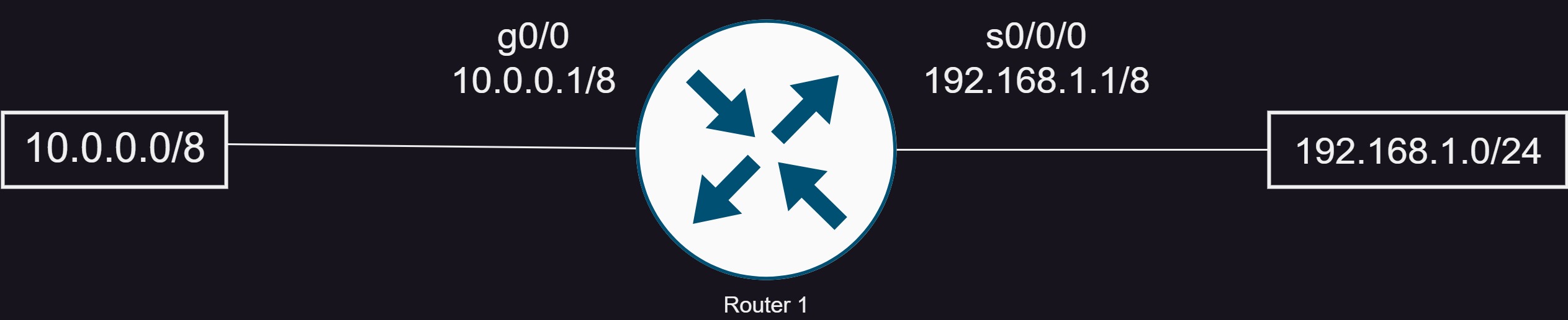 - `ip route 0.0.0.0 0.0.0.0 10.0.0.1` configure the default gate of Router 1 to 10.0.0.1 (Will go into detail next time)