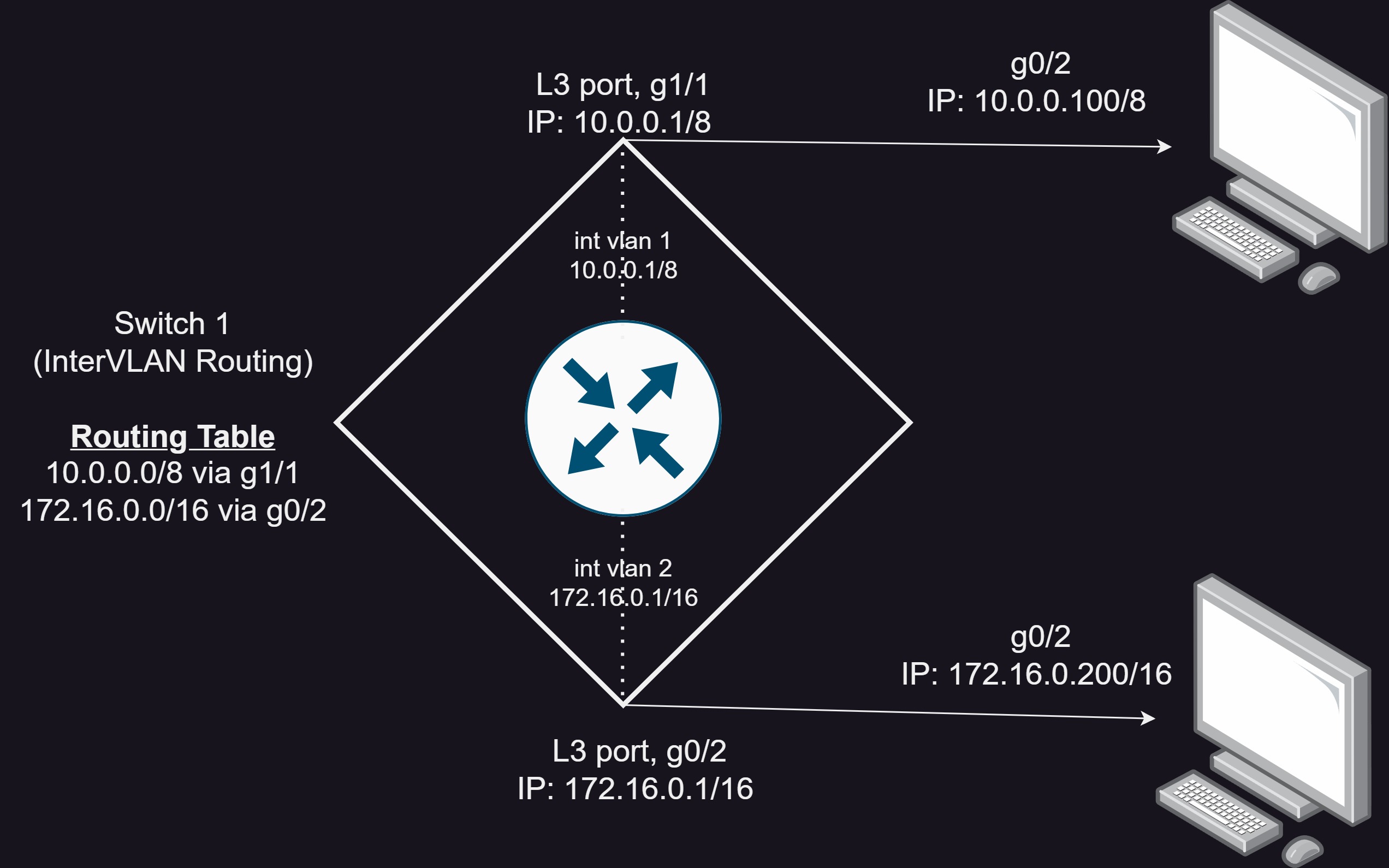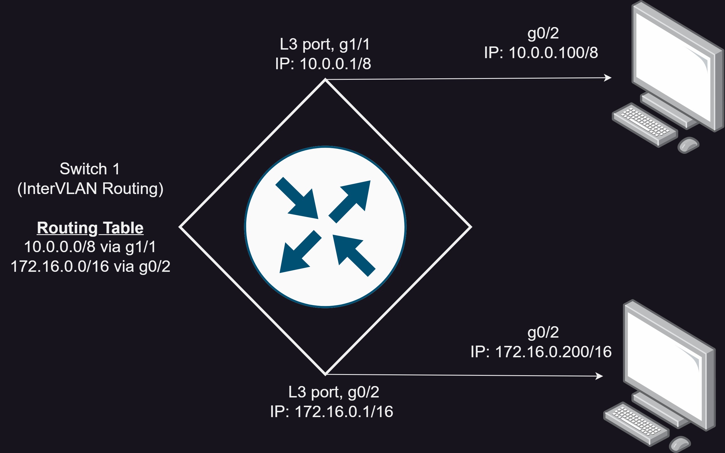 - Step 1: The setup, `no switchport` will turn a port from L2 to L3
